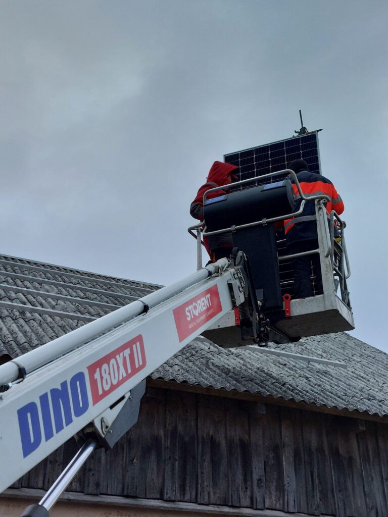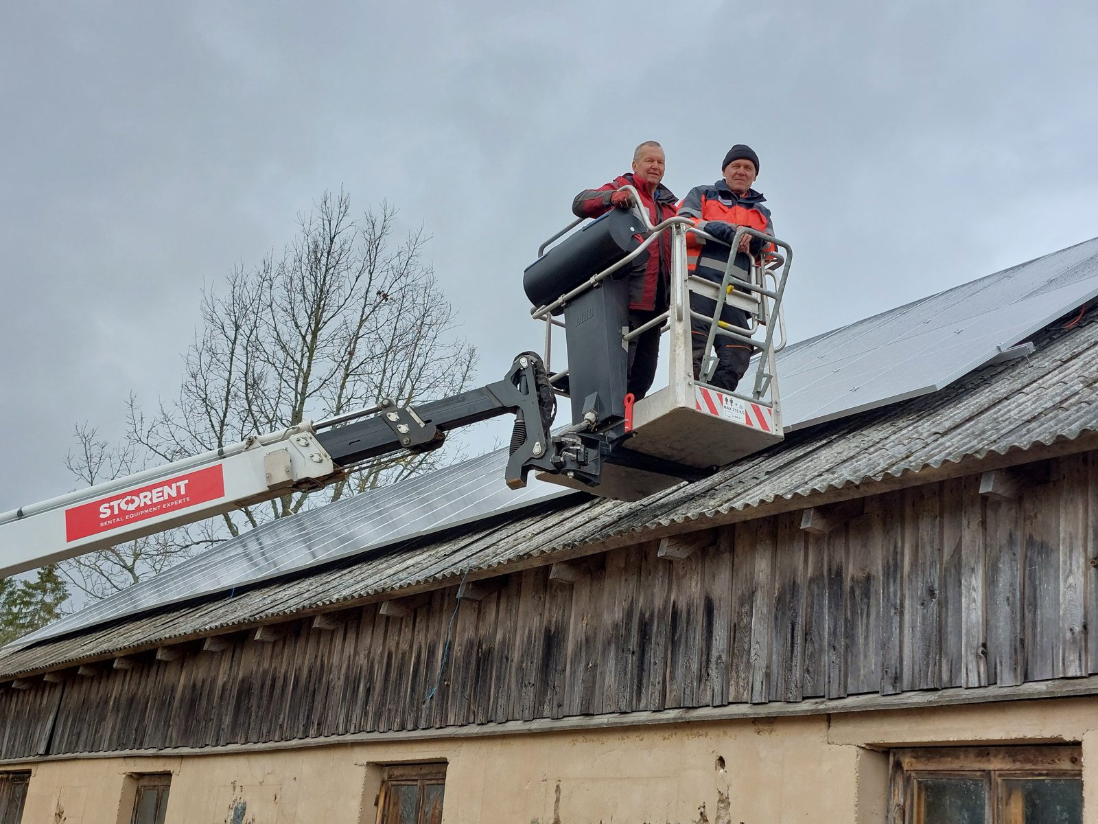 Kā redzams projekta fotogrāfijās, ēkai ir ievērojams jumta slīpums un specifisks viļņotais segums. Pārvietošanās pa šādu jumtu ar kājām būtu ne tikai bīstama, bet arī varētu radīt mikroplaisas vecajā segumā. Tāpēc “E-Stacija” pieņēma lēmumu montāžu veikt tikai un vienīgi no groza pacēlāja (Dino 180XT). Tas ļāva mūsu meistariem piekļūt jumta augstākajiem punktiem “bez pieskāriena”, saudzīgi uzstādot stiprinājumus un paneļus, neradot slodzi uz pašu jumta konstrukciju.