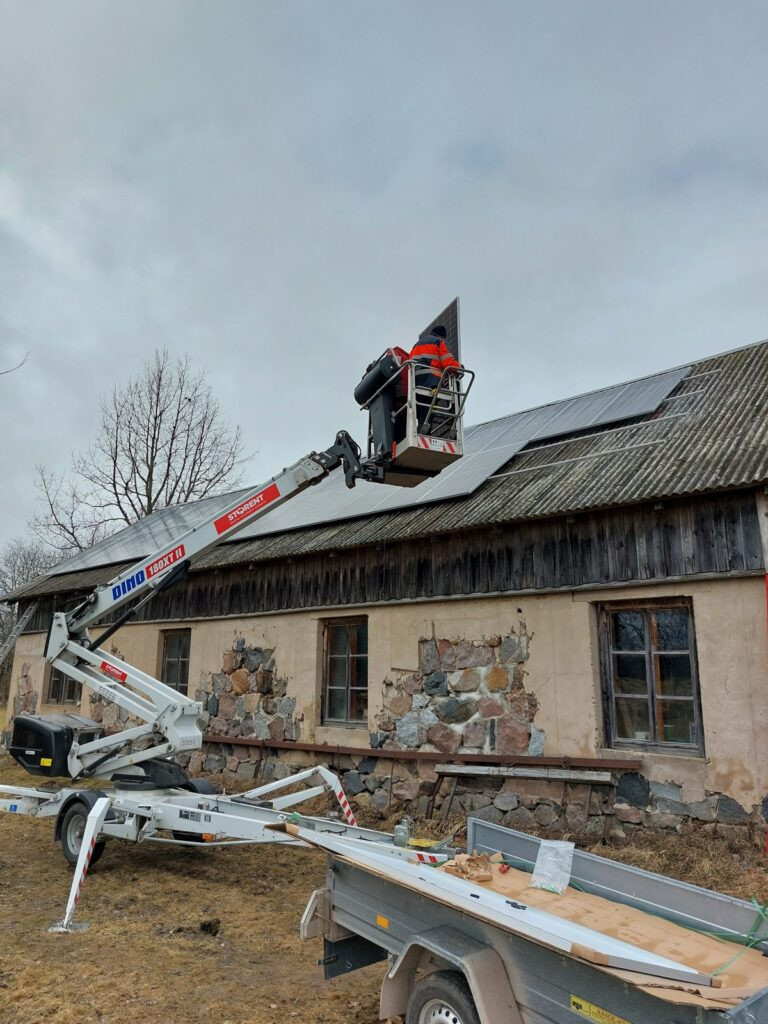 Šajā objektā izmantojām īpašus, viļņotajam segumam paredzētus nerūsējošā tērauda stiprinājumus (skrūves ar EPDM blīvēm), kas garantē pilnīgu hermētiskumu. Sistēmas jauda ir optimāla plašai privātmājai vai lauku īpašumam, nosedzot apkures (siltumsūkņa) un sadzīves elektrības patēriņu. Lai gan darbi notika augstumā un mainīgos laikapstākļos, komanda ievēroja visaugstākos darba drošības standartus – ķiveres, uzkabes un sertificēta pacēlāja izmantošana ir mūsu ikdiena, nevis izņēmums.