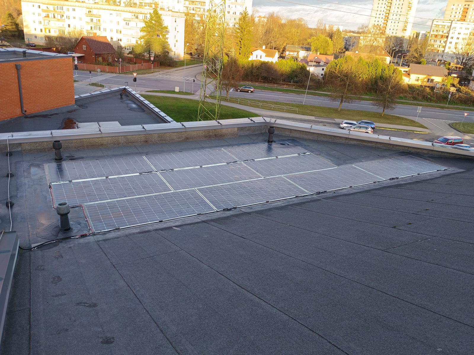Mūsu inženieri izstrādāja individuālu saules elektrostacijas projektu, uzstādot 30 fleksiblus 520 W saules paneļus (kopējā jauda aptuveni 15,6 kW), izmantojot inovatīvu līmēšanas tehnoloģiju tieši uz bitumena jumta virsmas. Sistēma aprīkota ar 15 kW invertoru, kas nodrošina efektīvu enerģijas pārveidošanu un integrāciju ar esošo elektrotīklu. Tika veikta rūpīga jumta virsmas sagatavošana un paneļu orientācija optimālai saules staru uztveršanai. Papildus sistēma ietver attālināto monitoringu, ļaujot klientam reāllaikā sekot līdzi ražošanas datiem.