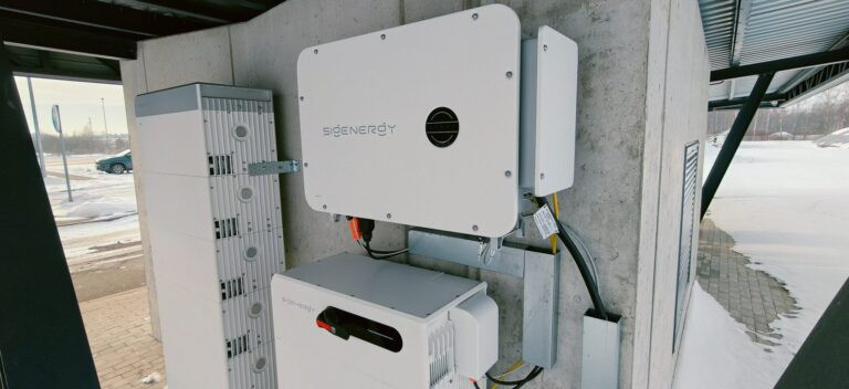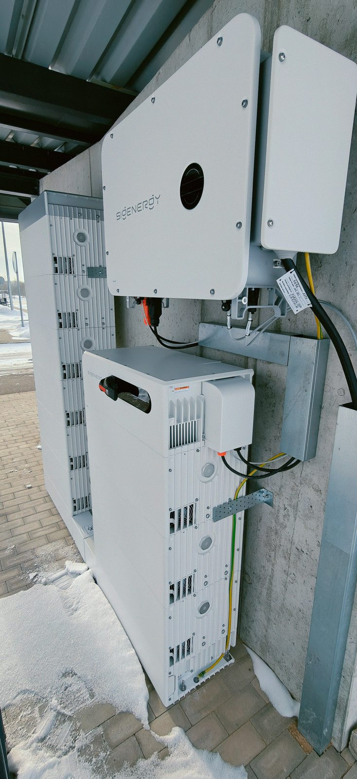 • Tehniskā Daļa: BESS ir uzstādīta zem nojumes uz bruģa, ar invertora jaudu 50 kW un akumulatoru ietilpību 108 kWh – tas nozīmē, ka tā var uzglabāt pietiekami daudz elektrības, lai darbinātu ēku vairākas stundas. BESS pieslēgta paralēli saules elektrostacijas sistēmai un darbojas automātiski.